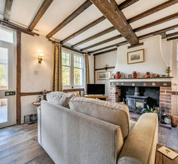 Offering brick fireplace with tiled hearth, timber lintel and woodburning stove inset, beamed ceiling, exposed timber framework and flooring, windows to front and side, door to stairs to first floor and door to;