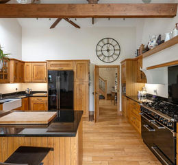 The heart of the home is the impressive breakfast kitchen, fitted with an extensive range of solid wood cabinetry, complemented by exposed beams and quality work surfaces. French doors open directly onto the rear terrace, creating a seamless connection between indoor and outdoor living. The kitchen flows into the elegant sitting room, featuring a statement gas fireplace and further double doors opening onto the gardens, ideal for entertaining or quiet evenings at home. Additional amenities include a useful utility room and a guest cloakroom.