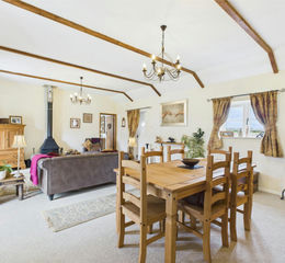 Two double glazed windows to front and rear, further door to rear garden, exposed granite around the windows, wood burner on slate hearth, electric heater, vaulted ceiling. Dining area opens into: