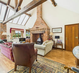 There is a fabulous character lounge/living room with a high vaulted ceiling having wonderful exposed roof truss and a part ceiling glazed feature having fitted blinds. A large brick fireplace has an inset gas fired log burner on a brick hearth with beam over, laminate flooring runs underfoot and double glazed French doors and windows overlook the garden.