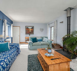 Internally, the property is entered through a traditional hallway with timber flooring and a winding staircase—setting the tone for the character throughout. To the right, the morning room is dual-aspect, filled with natural light, where a handsome log-burning stove set in a raised stone fireplace invites cosy evenings by the fire. The space is generous yet intimate, ideal for both family life and quiet retreat.