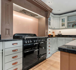 The kitchen at Wylde Green is a bespoke space designed for both serious cooking and everyday gathering. Crafted from solid wood with painted oak doors and finished in Farrow & Ball tones, it combines warmth with practicality. Granite worktops and modern glass splashbacks give a crisp finish, while a six-ring Rangemaster cooker with twin ovens provides the centrepiece.