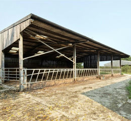 Open fronted. Steel frame with timber dung boarding, space board over and a profile sheet roof. Feed barriers to front with concrete apron.