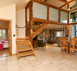 The interior retains great character with exposed timbers and wonderful open-plan living space, with vaulted ceilings and plenty of natural light. The main living area comprises a hallway and dining area, with a further living area and kitchen all with tiled flooring and LED lighting.