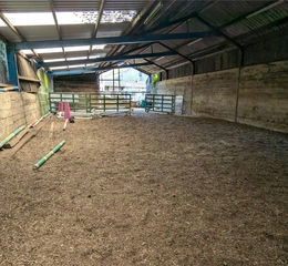 10.25m x 7.69m. Steel portal frame, brick and block walls, asbestos cement roof covering, concrete floor, fitted with internal metal and composite plastic stable partitions which can be relocated as desired, mains water supply. Currently providing two large stables, wash-down stable with solarium, all fitted with “quarry-belt” mats, and storage space.