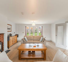To one side, the main reception room offers the perfect blend of warmth and elegance. A log burner provides a central focus, making it an inviting retreat for winter evenings after a windswept walk along Brancaster Beach. In the warmer months, French doors open directly to the garden, allowing this lovely room to transform into a cool and airy space that connects seamlessly to the patio, ideally positioned to capture the afternoon and evening sunshine.