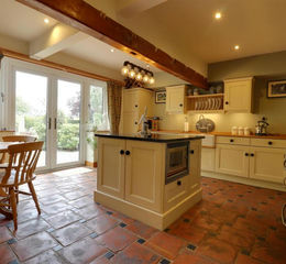 Kitchen - 4.93 x 4.32 (16'2" x 14'2") - A range of hand-painted wall and base units are complemented by the Terracotta floor tiles. Beech work surfaces over. Granite island with power, storage and space for a built-in microwave, integrated bin storage. Integrated dishwasher. Integrated fridge and freezer each with storage below. Range cooker with 7 ring LPG gas hob and two electric ovens and grill below, extraction hood above. Double Belfast sink with traditional mixer tap set. Smart corner storage. French doors leading direct to the patio and garden. Space for a table. Doors leading to Utility and Garage.