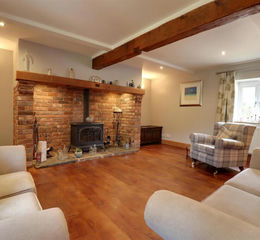 Sitting Room - 5.47 x 5.41 (17'11" x 17'8") - Feature beamed ceiling with dual aspect windows. LPG stove effect fire and over-sized brick surround with York Stone hearth. External door providing access to the garden.