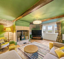 The sitting room has a fabulous parquet-tiled floor which continues throughout the ground floor. It has astonishing views out over the valley, courtesy of a bank of three mullioned windows, with timber surrounds. There is a wall of exposed stone and a beautiful stone fireplace with raised stone hearth with stone, exposed backcloth and all being home for a cast-iron stove with glazed door. There are beams on display and a number of wall light points and a central ceiling light point. Across the hallway, a similar, stylish timber and glazed door leads through to the fabulous dining/living kitchen.
