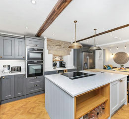To the front, courtesy of mullioned windows, and bifold doors out over the courtyard-style side garden, this room has two differing ceiling heights, one of which being particularly tall with angled ceiling line with chandelier point and inset spot lighting. The room has a whole host of lighting points, including those above the large, island unit with fabulous working surface and polished, timber breakfast bar with seating for four. The island unit has a NEFF induction hob, a NEFF extractor fan and the kitchen is superb in terms of layout and amount of cupboard space with glazed display cabinets, surround for an American-style fridge freezer with ice dispenser. There is a Belfast sink with stylish mixer taps above, integrated dishwasher, inbuilt double ovens, once again, of NEFF manufacture.