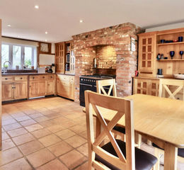 Dual aspect kitchen/breakfast room affording views of both the courtyard garden and fields, with terracotta floors, hand made solid wood cabinetry and a walk in pantry.