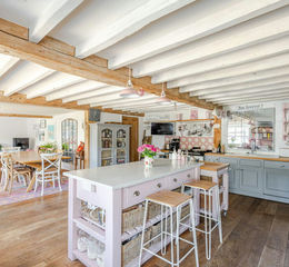 Internally, the well-presented accommodation extends to around 2,410 sq.ft. arranged over two floors. The ground floor layout opens to an entrance hall with galleried landing above and a downstairs WC off. Featuring a cosy wood-burning stove, the dual-aspect living room is positioned at the rear with double doors leading out to the garden. At the heart of the home there is a superb kitchen/family room with a characterful timber beamed ceiling. The traditional country style kitchen is complete with an Aga. There is a useful large utility room with side access. The first floor boasts magnificent high vaulted ceilings. There are four good-sized double bedrooms. The main bedroom has a fantastic walk-in wardrobe and en-suite shower room. The modern family bathroom is equipped with a shower over the bath.