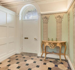 As soon as you step over the threshold of the handsome door set beneath the curved transom window, you will catch glimpses of incredible original features. This spacious porch with beautiful ceiling mouldings is practically a room in itself, where welcoming guests feels effortless and comfortable, enhanced by the handy downstairs cloakroom found to your right. Even this bathroom has nods to its grand heritage with an arched alcove, which gives hand washing an elegant upgrade.