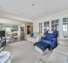 The property is approached via a sweeping driveway, and benefits from glorious views across its adjoining paddocks and woodland beyond. The house offers versatile, well-proportioned and light-filled accommodation arranged over two floors. At the heart of the home is a generous open-plan kitchen/family room which flows seamlessly into a comfortable sitting area, ideal for both everyday family life and entertaining. The generous sitting room affords a delightful aspect to the front of the property, together with a prominent fireplace as the focal point, and features folding doors which open to the sitting area, creating a wonderful open plan living space.