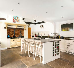 The kitchen overlooks and has French doors to the courtyard; it has a partially vaulted ceiling and exposed timbers. A two-oven electric Aga (AIMS system) is set in an exposed brick chimney breast with a lintel above surmounted by a stone mantel shelf with moulded console brackets. There are fitted base and wall Shaker style units with granite worksurfaces and an inset butler’s sink. A central island with a Dekton worksurface includes a 24-bottle wine rack with further storage cupboards and breakfast seating for at least four. Integrated appliances include an induction hob, a Neff oven, and a Miele dishwasher. Open plan with the kitchen/breakfast area, the transition to the family area has a visual marker in the form of an historic structural pillar. There is a floor-to-ceiling cupboard with double chalk-board doors. The seating area has French doors to the courtyard and oak doors to the dining room. There is a partially exposed brick wall with storage; the entire area (truncated)