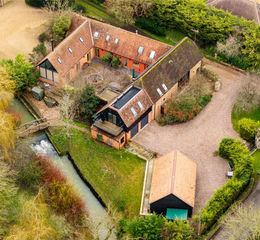 – Five-bedroom converted brick barn with tiled roof within a conservation village – Approximately 0.5 acres plot with mill stream frontage and a private island garden – Double-height vaulted living room with ‘cathedral-type’ glazed gable window – Exposed historic oak beams and original architectural details – High-quality modern specification throughout – Flexible layout with potential for dual living or income use – Extensive garaging and parking