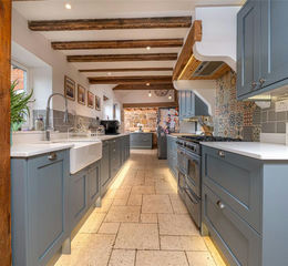 Having a range of base cupboards and drawers, wall units over, concealed lighting over and under the units, Quartz worktops, two white sinks with swan mixer taps, built-in gas seven burner Belling stove with ovens and grill under, extractor hood and lighting, integrated dishwasher, timber mantel, exposed beamed ceilings with trusses, split stable multi-paned back door to the formal walled gardens and double glazed windows, recessed storage cupboard under the stairwell with original latch door, spotlighting to ceiling, continuation tiled flooring throughout. There is a recessed pantry store with built-in shelving, access latch door with stairs leading down to two cellars storage areas with light and power.