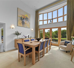 Adjacent to the dining room is a modern, sleek kitchen equipped with Neff appliances – replete with wine fridge - and a central island. This kitchen is not just a culinary workspace but a vibrant heart of the home, where functionality meets style in a seamless blend. The space opens out to a serene garden room, providing a perfect spot for morning coffees or evening relaxation, overlooking the sprawling gardens.