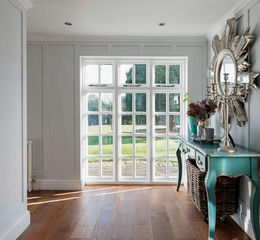 An entrance hall provides access to the reception rooms, including a living room with open fireplace, a glazed dining room overlooking fields to the rear, a conservatory, and a separate study currently used as a fifth bedroom. The open-plan kitchen, dining and living space includes an AGA, integrated Miele and Bosch appliances, a snug area, and a separate utility room. A side entrance leads into a boot room, and the former double garage has been converted into a home gym.