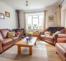 A large family living area with windows to the rear and patio doors opening through to the conservatory, wood burning stove with solid Minster stone carved surround, two radiators and door to study.