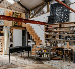 A studio spanning over 760 sq ft lies near the house. Currently used for painting, it is a capacious, flexible space with a mezzanine level and skylights.