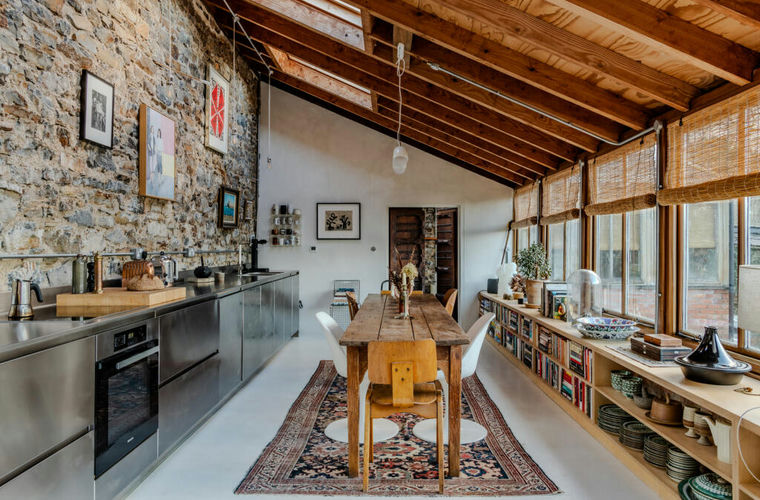 Entry is to the main living space, a long, lateral room used for dining, relaxing and cooking. Stainless-steel units run along one side, equipped with Miele appliances. On the other, a bank of windows with open storage beneath captures arresting views out to the garden. Textured brick and stone walls are softened by the underfloor heating that runs underfoot.