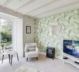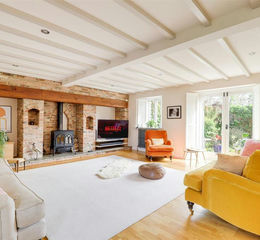 Dimensions: 6.64m max x 5.52m (21'9" max x 18'1"). The living room features engineered wood flooring, exposed ceiling beams, and two traditional-style school radiators. It has a TV point, recessed spotlights, and a wall-to-wall inglenook fireplace with exposed brick pillars, a flagstone hearth, and a log-burning stove. A double-glazed window with bespoke shutters overlooks the garden, alongside two sets of double doors, also with bespoke shutters, opening directly onto the garden.