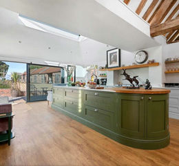 Open Plan Living/Dining Kitchen - 10.74m x 6.63m max (35'3" x 21'9" max) - A truly stunning light and airy space which has been sympathetically extended to the rear elevation with a more contemporary addition having large, double glazed, sliding aluminium doors to two elevations providing a fantastic outlook onto the rear garden with elevated views beyond. An initial snug area offers a beautiful exposed brick chimney breast with inset period stove, access out into the garden at the side and a stunning vaulted ceiling with exposed king post, truss and beams. This in turn leads through into the kitchen, again having vaulted ceiling and views into the rear garden. The kitchen is tastefully appointed with a range of bespoke units finished in heritage style colours with a combination of work surfaces including marble preparation areas, having a central island unit with Belfast style ceramic sink with chrome swan neck mixer tap and separate Quooker boiling tap. In addition there is a beautiful floor standing range providing cooking facilities and, overall this is a stunning space perfect for everyday living.