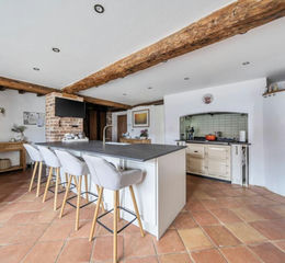 The Kitchen/Breakfast room has tiled flooring with under-floor-heating. The Recently fitted country-style kitchen has a range of modern fitted wall and base units with heat and stain resistant luxury work-tops. Matching central island with integrated twin Belfast sink. Integrated wine fridge. Electric Aga with original bread oven. Space for American-style Fridge/Freezer. Feature exposed brick column. Exposed original beams. Oak Barn door. Lovely sash windows. Archway leading through to the Pantry.