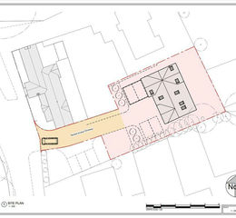 A shared access shown shaded yellow extends to the side of the Red Lion, with a 50/50 split of future maintenance costs, giving access to the plot with parking spaces and car port with garden area to rear.