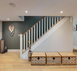 Farmhouse Chic And Contemporary Design - Head towards the wooden portico and step into the main entrance hall, which gives an impressive introduction to what lies ahead. A part exposed brick and timber feature wall leads you to the spacious, open-plan kitchen and dining area. Wooden window shutters mingle with bespoke units, quartz worktops and integrated appliances to create a stylish contrast between traditional farmhouse chic and contemporary design. Dual-aspect windows allow natural light to flood in, and a breakfast island provides the perfect spot for enjoying your morning coffee. There’s also plenty of space for an 8 seater dining table, making it a wonderful hub for catching up with family and friends over a homemade feast.